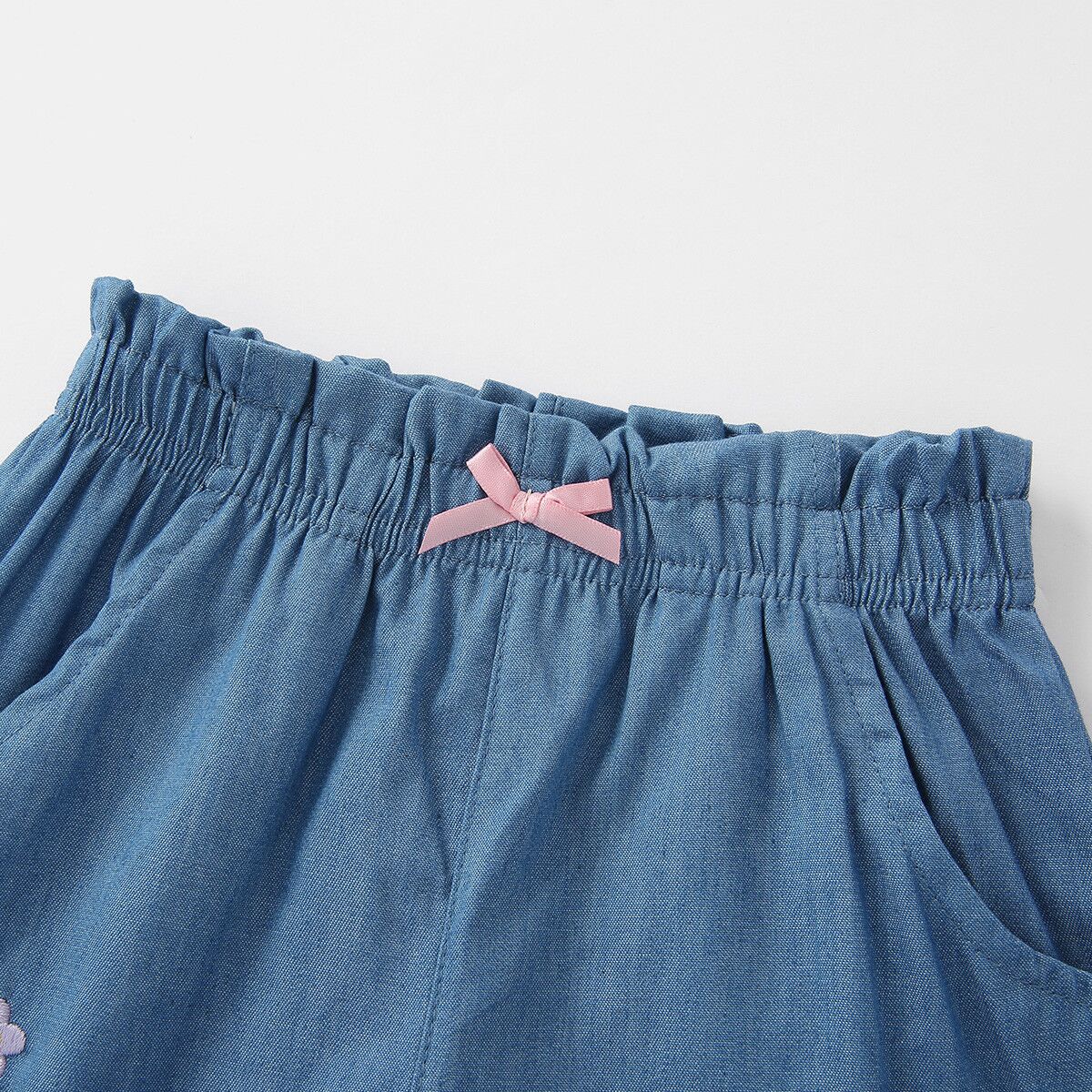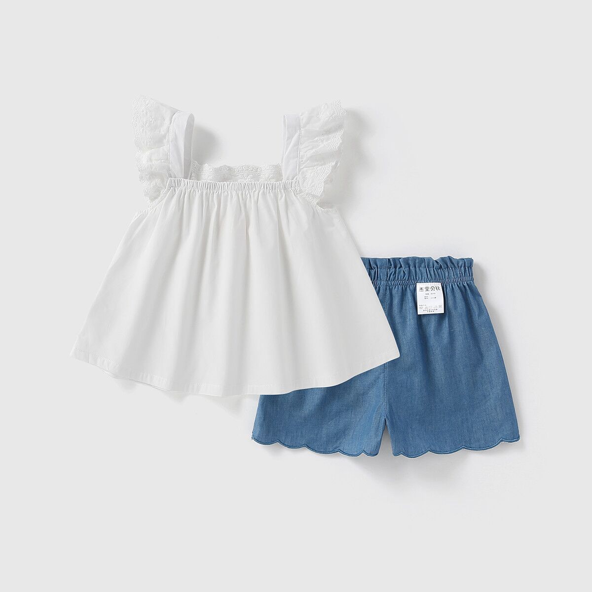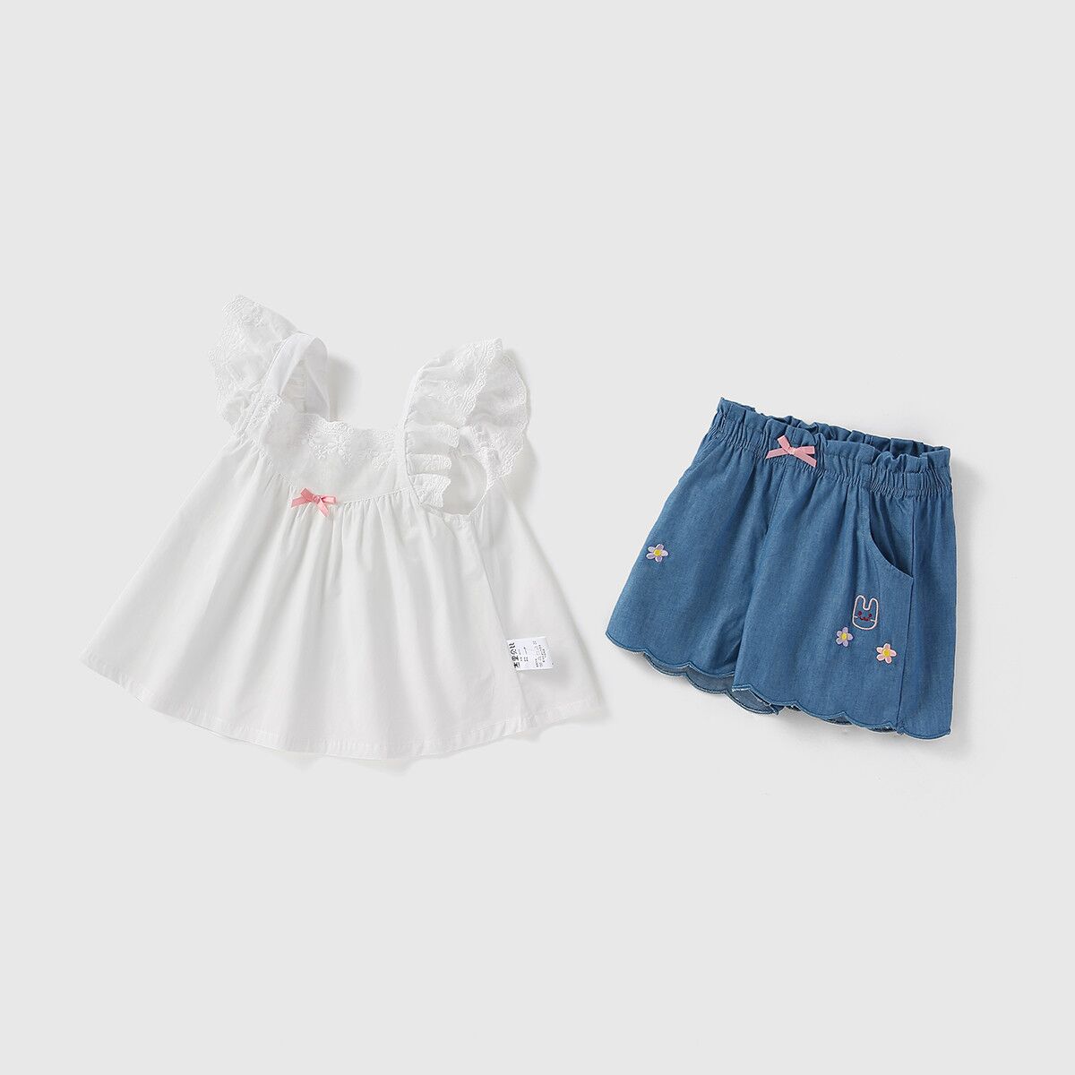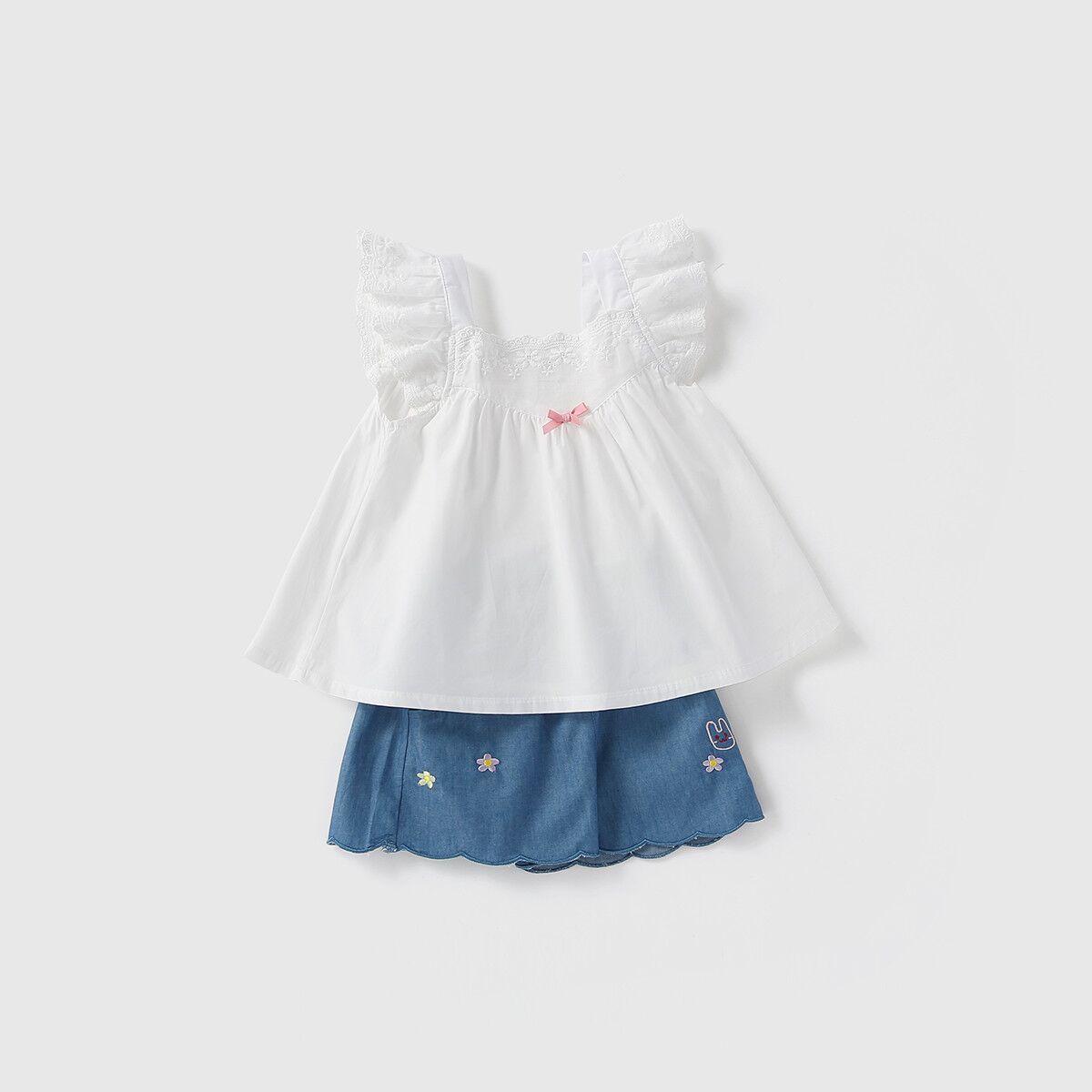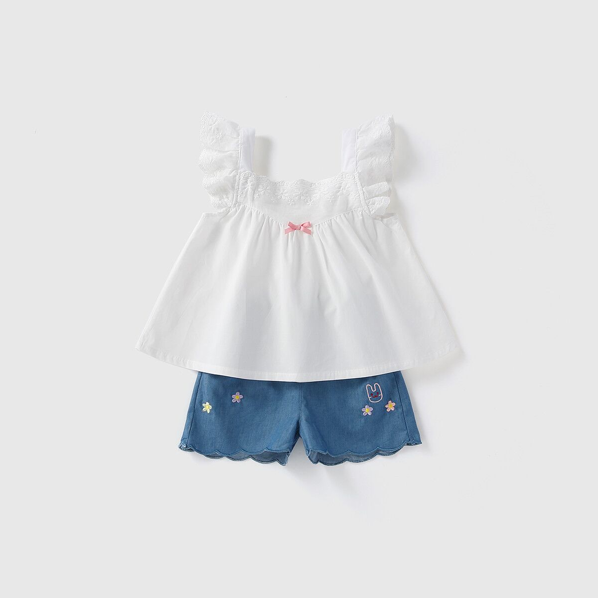 The suit crafted from pure soft cotton, ensures children in sheer comfort all day long, moving and playing freely. The little top is cut to A-line silhouette, decorated with embroidered floral and butterfly sleeves, floaty and delicate. The pairing jean short pant is not only gentle to skin but also cool, perfect for hot days. Simply floral and animal embroidery adds kids’ cute element for the whole set