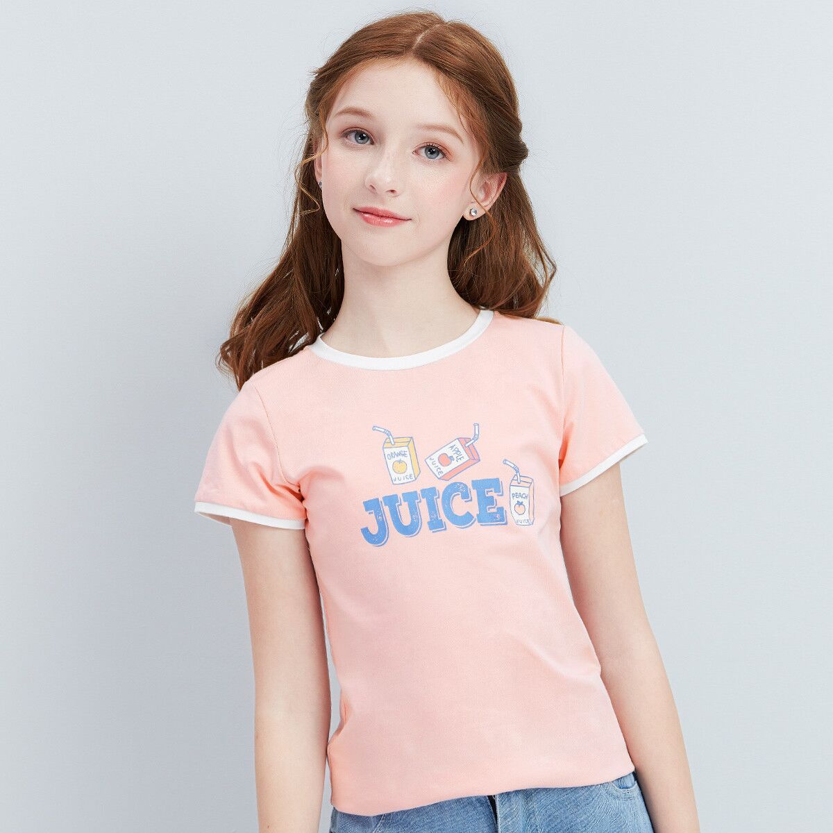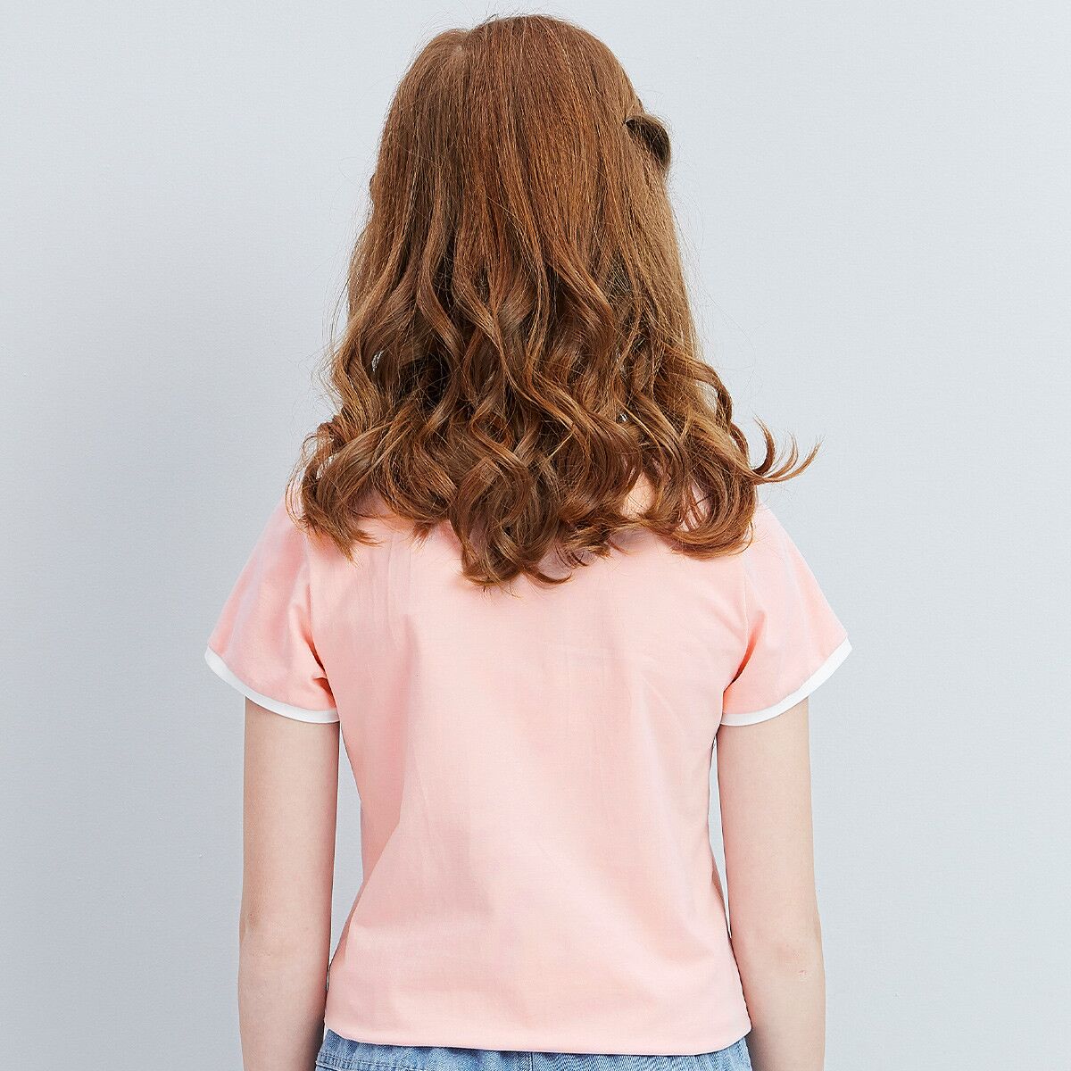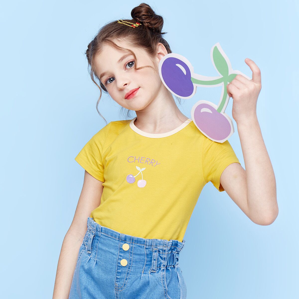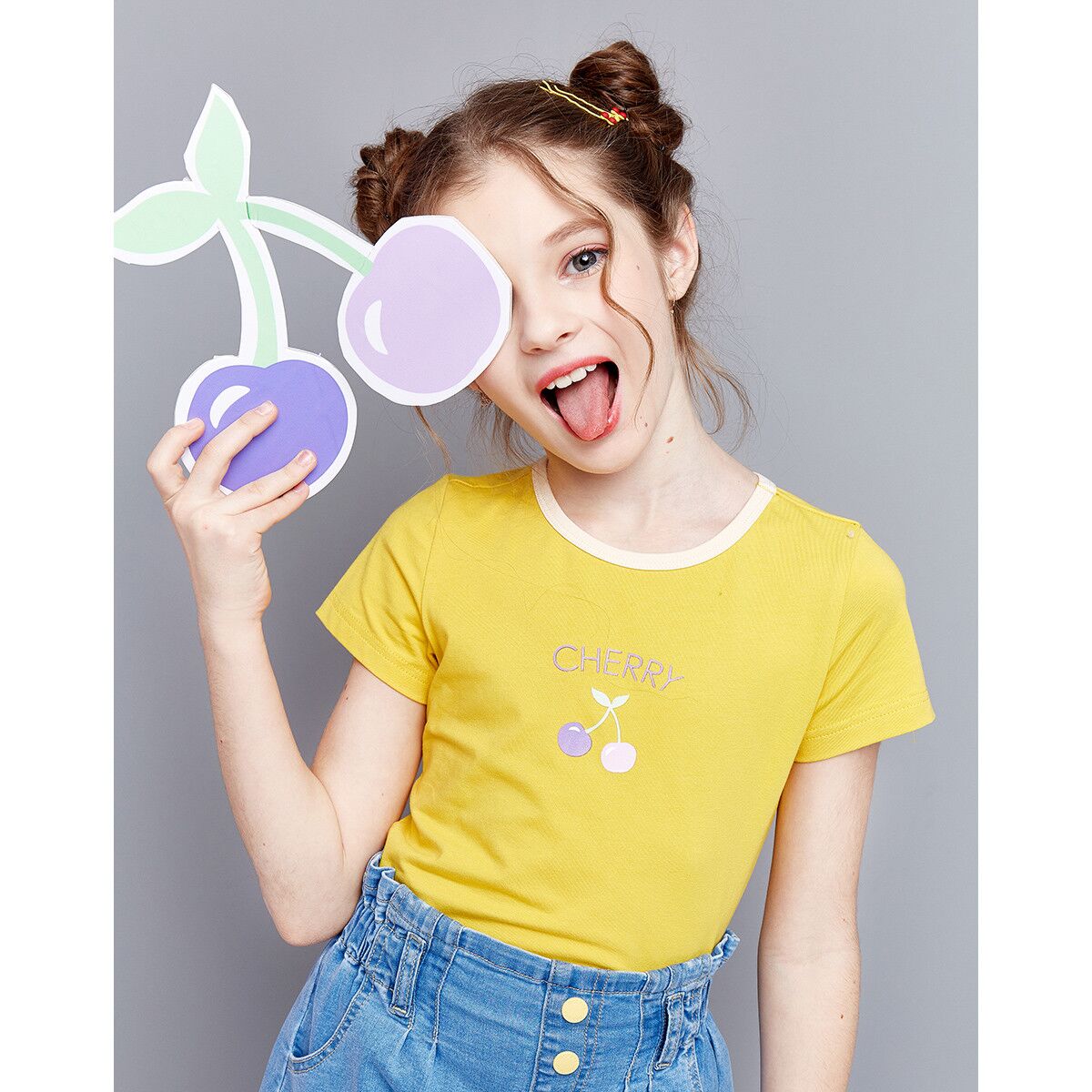 Crafted from a premium soft mixed cotton blend, the exquisite T-shirt makes children in sheer comfort all day. The pretty piece features round neckline traced with contrasting line. Adorable fruit and letter motifs disclose children’s fun in the carefree time. It is easily pairs with skirt or pant with multiple colors